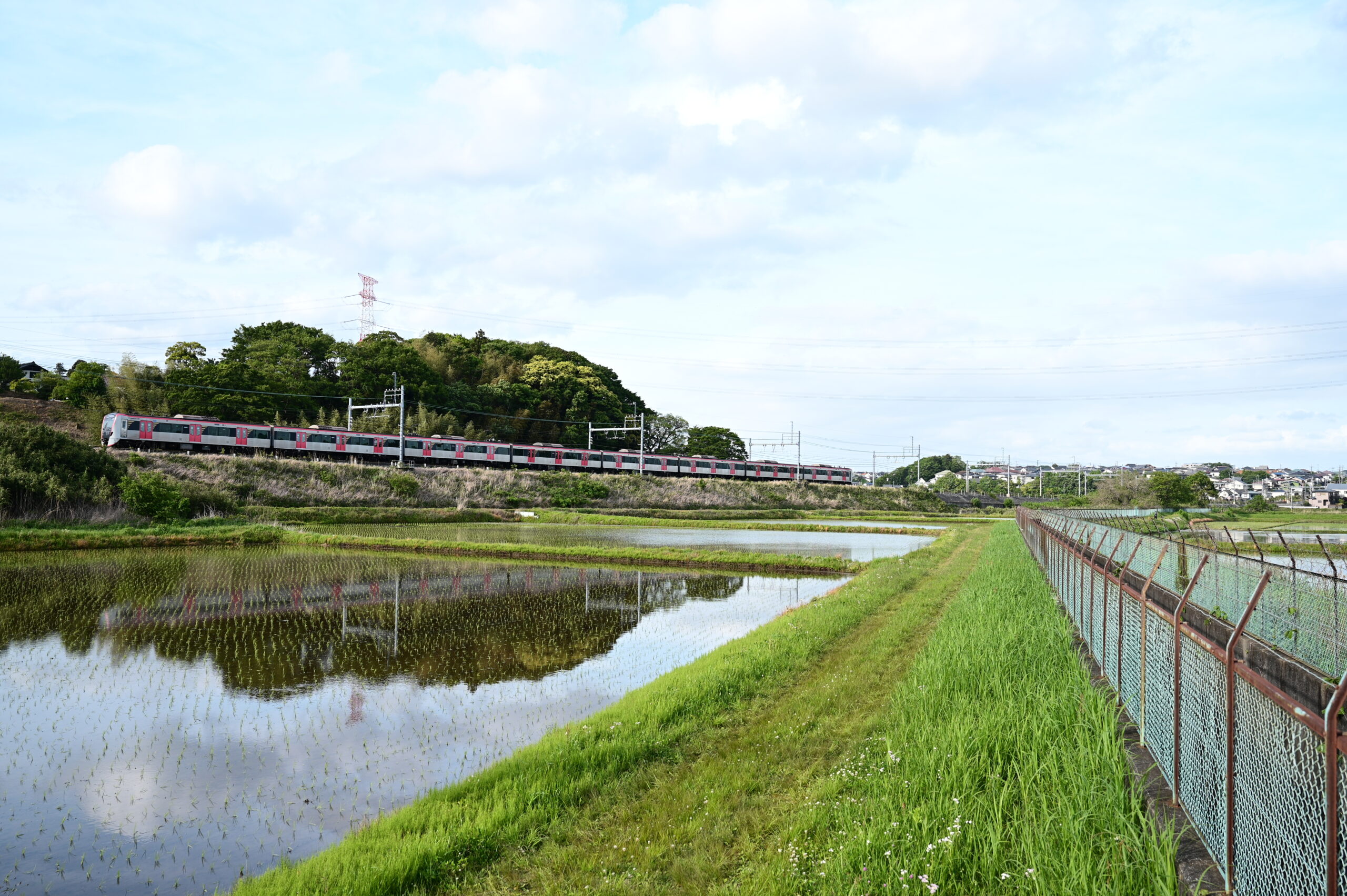 京成本線の田んぼ映り込み。下が加工前。 でもくもり気味だったのであんまり。。。 苗が大きくなり過ぎないうちに、お天気の良い時にまた。 |